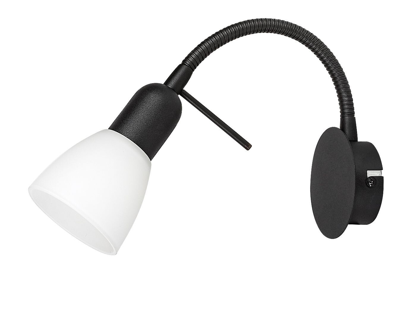 The Rabalux Soma spot lamp is recommended for those who would like to complement the lighting of their bedroom or living room with a wall-mounted lamp in classic colours. The wall light is made of metal with a black fixture and a white, A-shaped glass lampshade. It can be fixed to the wall using a small round decorative base. Thanks to the flexible arm, the lamp head can be moved so that the light of the spot lamp can be directed as desired. This is a particularly useful feature for reading or working. The spot light can be operated with a single light bulb with a power of up to 40 W. Socket type is E14. Depending on your taste, you can choose a lightsource emitting a warm or natural white light. The lamp features a black cable and a cable switch. It is supplied without a lightsource.