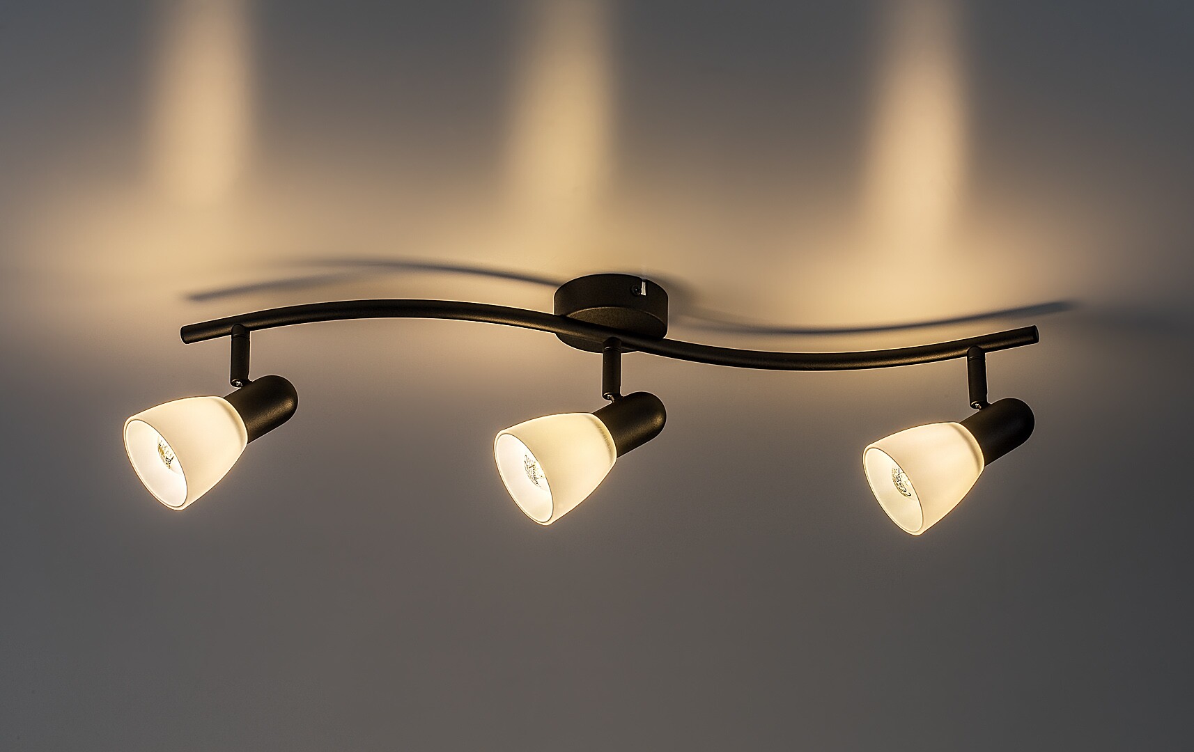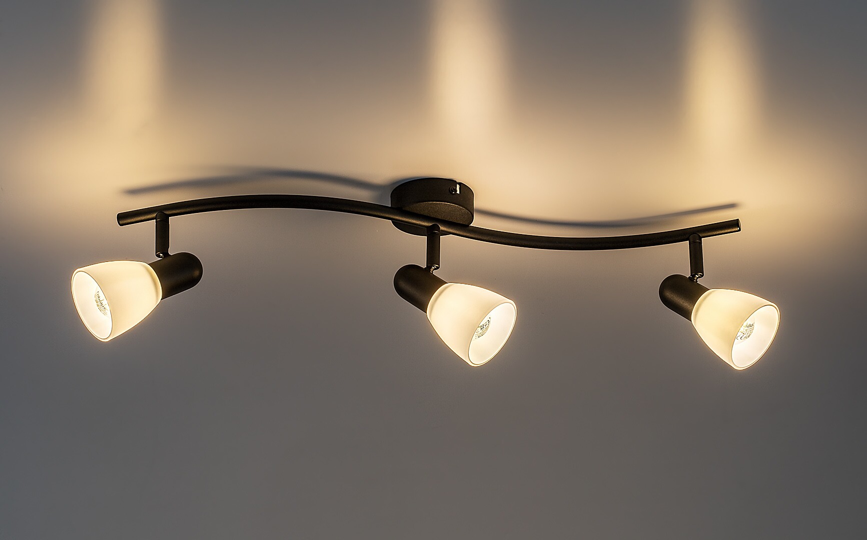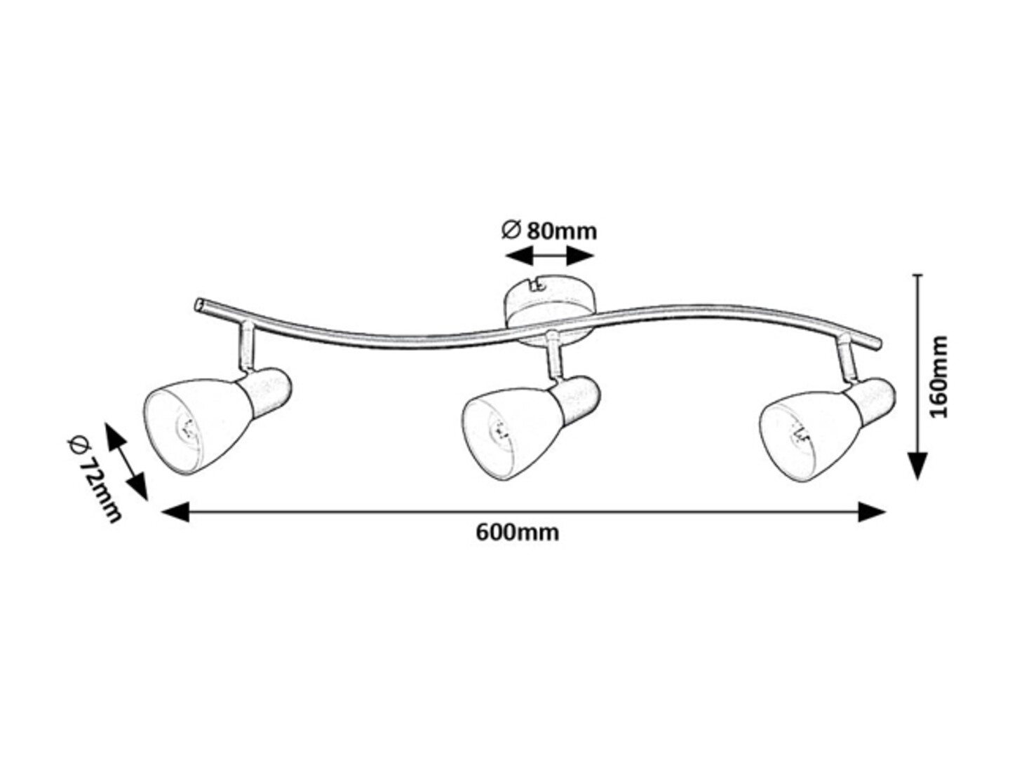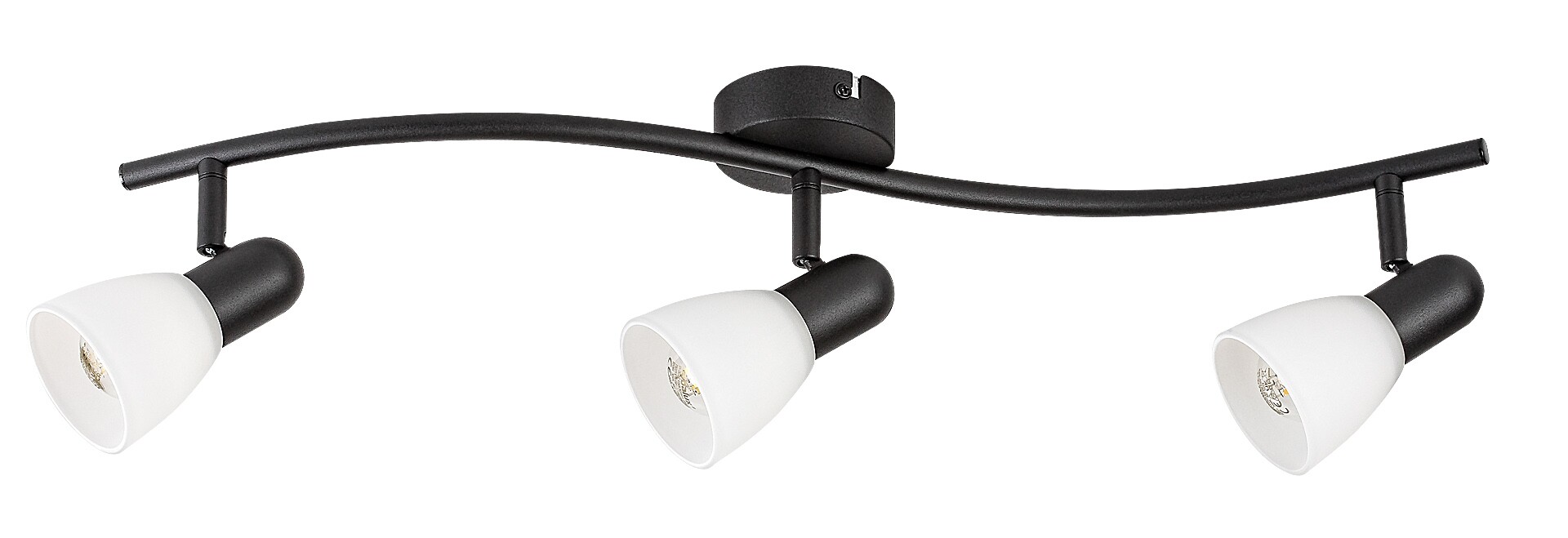 The Rabalux Soma 3-bulb ceiling spotlight is recommended for those who prefer movable lamps offering concentrated illumination rather than diffused light. This elegant model is ideal for the living room, dining room, hallway or bedroom. The spot lamp is made of metal with a black fixture and white, A-shaped glass shades. It can be fixed to the ceiling using a small round decorative base. The lamp heads are arranged in a row, side by side, on the curved support rail attached to the decorative base, and are movable thanks to the ball joint solution. The well-directed light beams ensure efficient lighting of the room. The 3-bulb spot lamp can be operated with three lightsources, each with a power of up to 40 W. Socket type is E14. This model is supplied without lightsources.