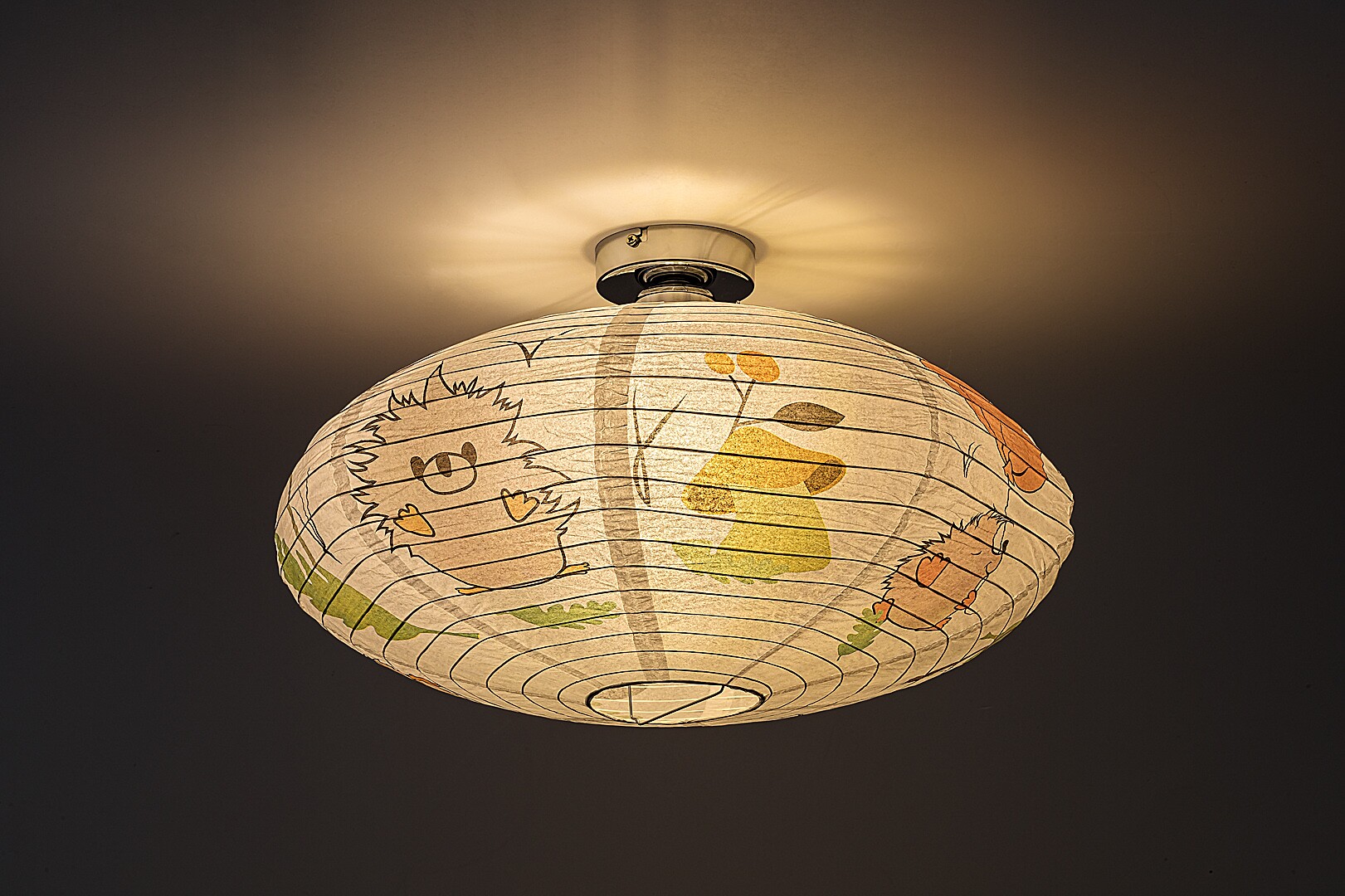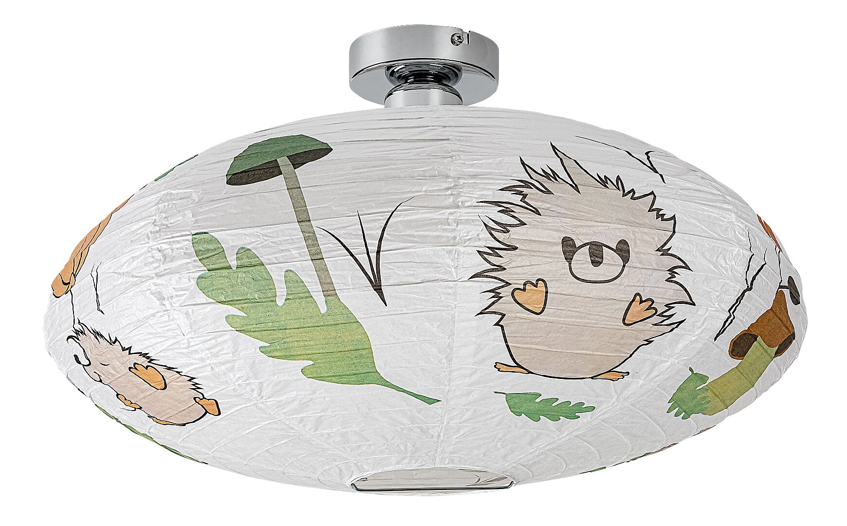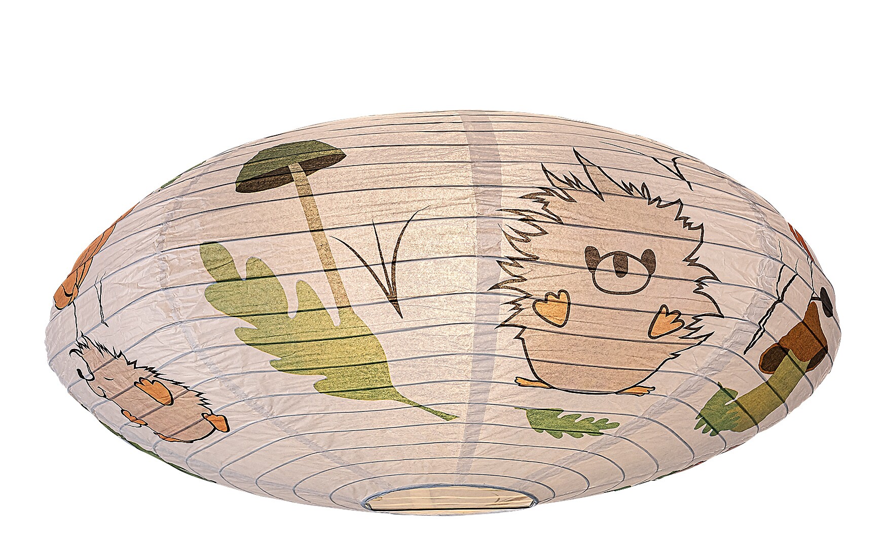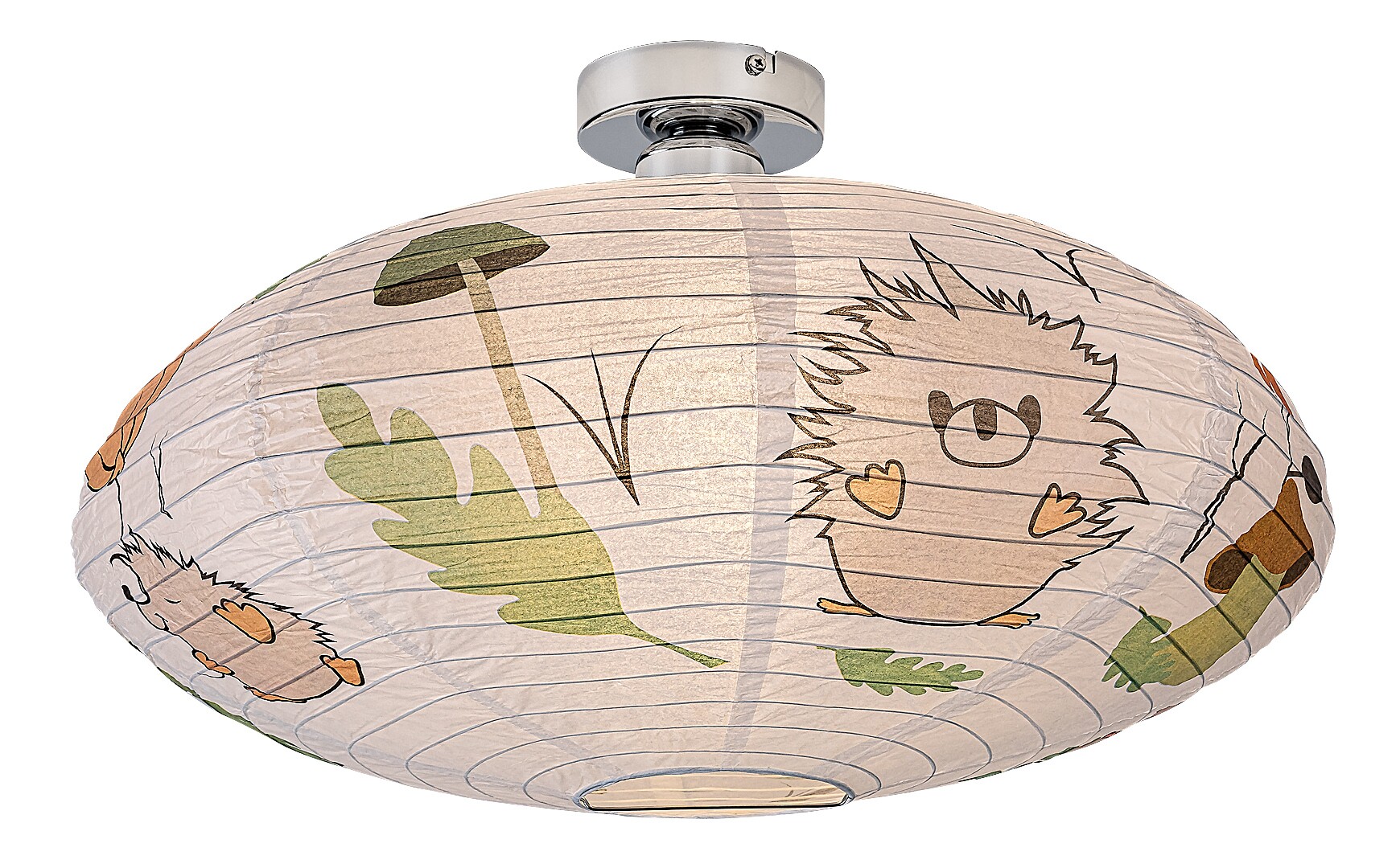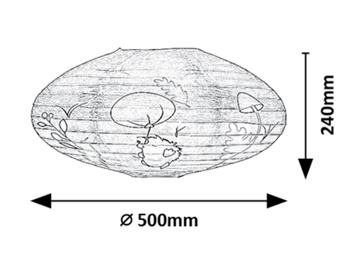 Rabalux Hedgy paper children’s ceiling light is a self-designed model by Rabalux. It is ideal for those who want to make their children's room even more inviting with cute, cheerful motifs. The lamp has a flattened, rounded shape, is made of paper and decorated with a lovely hedgehog and balloon pattern that is guaranteed to steal the heart of the room's occupant. The typical colours of the motif are shades of orange, brown and green, which are pleasant and soothing to the eye and radiate warmth. The children’s lamp can be used with a single light bulb with a power of up to 40 W. If you wish to enhance the cosy, intimate atmosphere, choose a light source emitting a warm white light. The children’s room light is supplied without socket and light source.