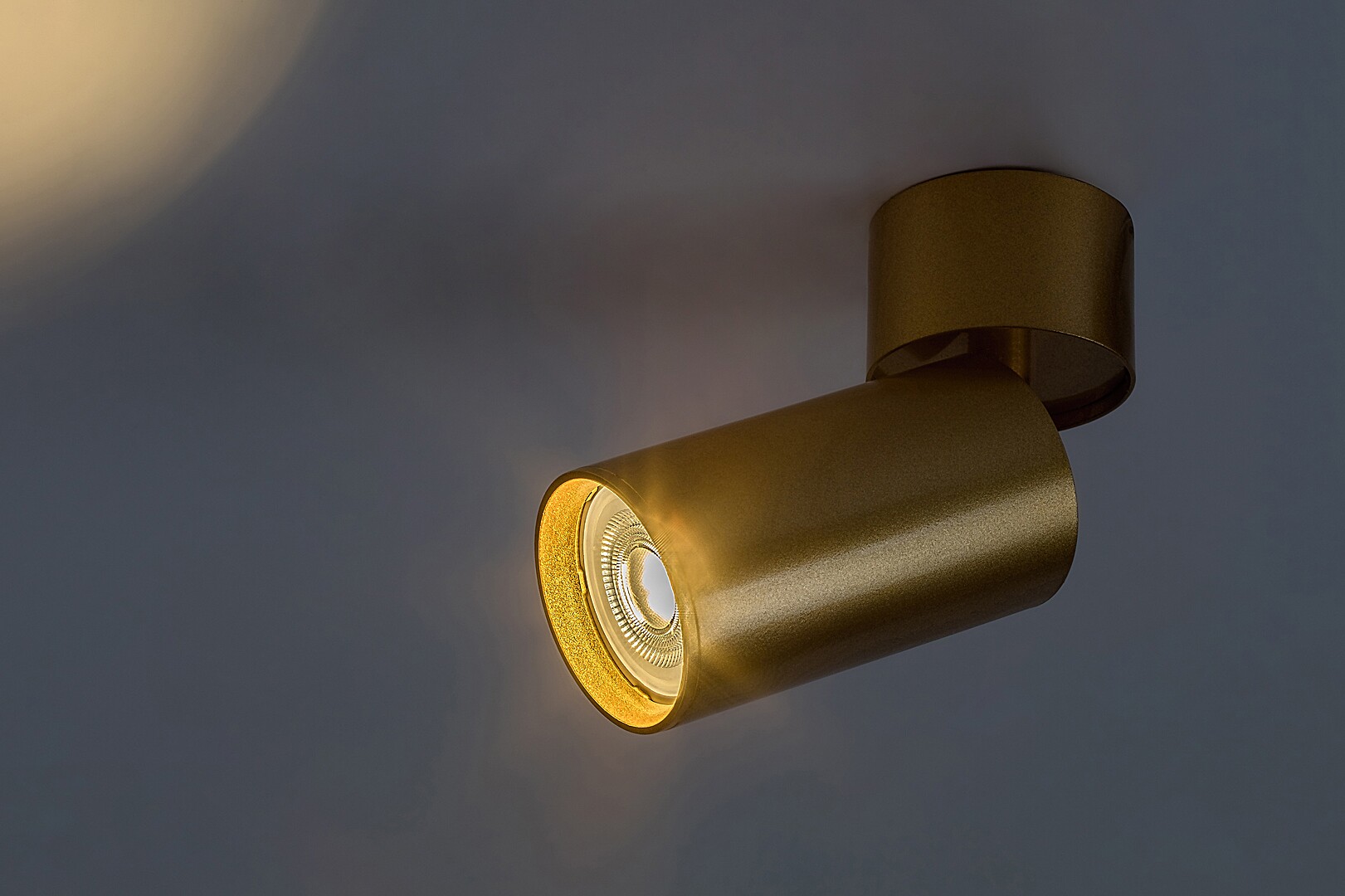 Rabalux Mirina ceiling spotlight is recommended to those who are looking for a model that combines minimalist design with elegance. The ceiling lamp is characterised by a small diameter and a cylindrical shape. It is made of metal in a brilliant gold colour and is complemented by an aluminium lampshade. The practical lamp head is flexible so that the light from the spot lamp can always be directed in the room as required. This model can be used with a single light bulb with a power of up to 5 W. Socket type is GU10. An eye-catching solution can be to place several identical lamps in the room - the size of this spotlight makes it perfect for this. It is ideal for the living room, bedroom or workroom. Depending on the room where you wish to install the lamp, you can choose a bulb radiating a warm or natural white light. The ceiling lamp is supplied without a light source.