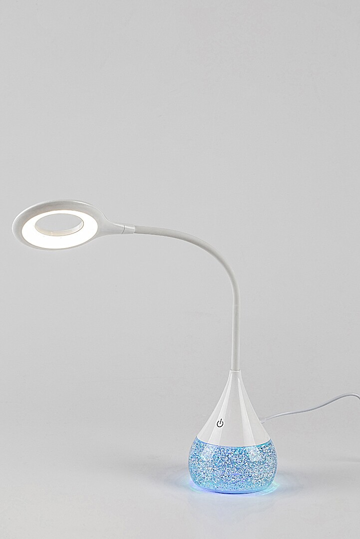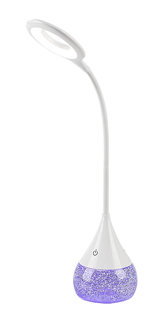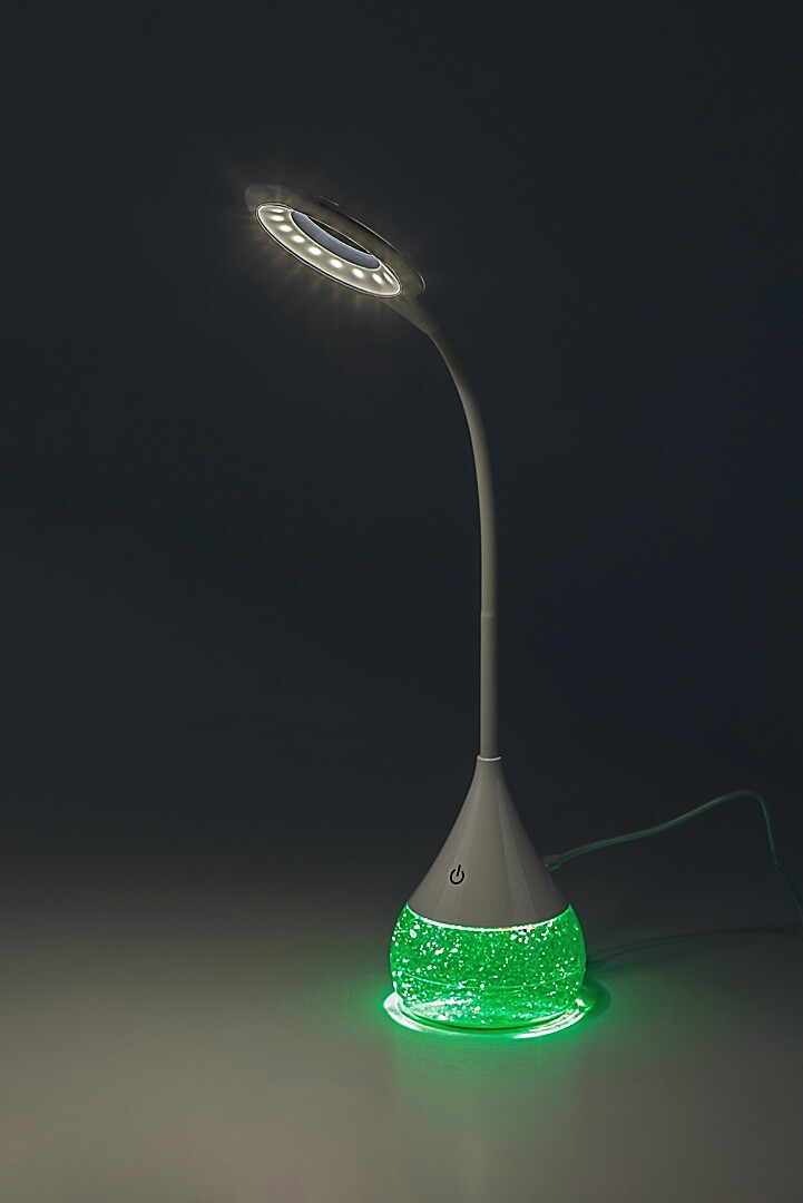 Rabalux Vivter table lamp is ideal for those looking for a complementary lamp with extensive functionality. This smart model is fully made of plastic in white. The arm is thin, cylindrical in shape and ends in a doughnut-shaped flexible lamp head. The fixture widens at the bottom, and the rotund part, which acts as a base, contains a micaceous material that can be moved - this part can be switched separately. The lamp is capable of RGB lighting, which allows the micaceous fill to shine in a wide variety of colours. The design light has a built-in LED light source that radiates a natural white light. The luminous intensity can be adjusted by a touch switch on the lower part of the lamp. The table lamp is the ideal choice for the living room, bedroom or workroom.