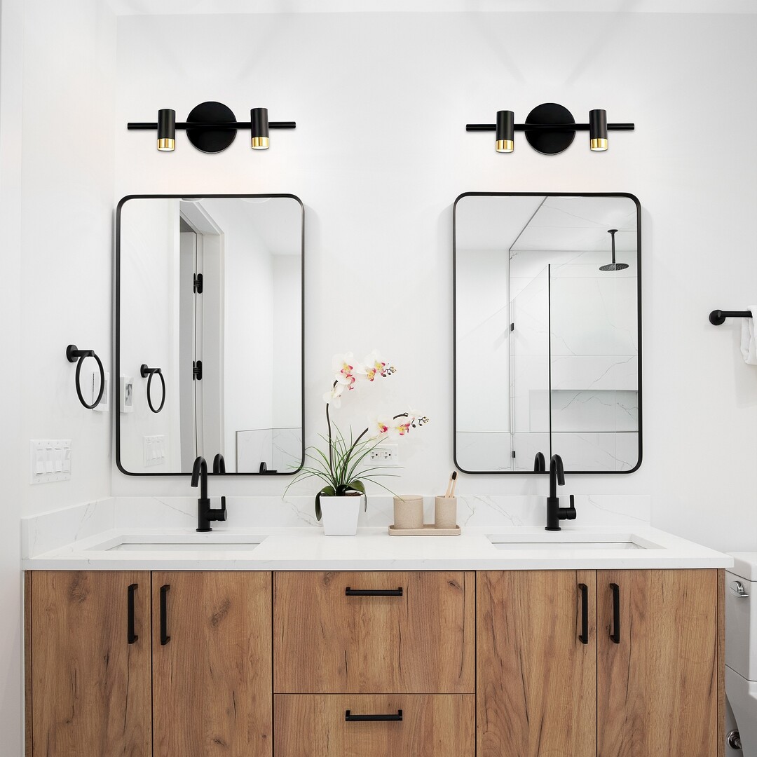 Rabalux Kadir 2-bulb wall light is recommended to those looking for a model that combines clean design with elegance. This LED lamp is conceived in the spirit of industrial style in black and gold, with a cylindrical fixture and transparent plastic lampshades. The decorative base is round in shape, black in colour and has a horizontal bar attached to it. It holds the two downward-facing lamp heads, located to the right and left of the decorative base. The wall light is equipped with a switch and has a built-in LED light source that emits a natural white light. As this model is protected against the intrusion of solid particles with a diameter of 1 mm or more and against water splashing from any direction, we recommend it not only for the living room but also for the bathroom with peace of mind. Due to the LED technology, it is characterised by energy-efficient operation and a long lifespan.