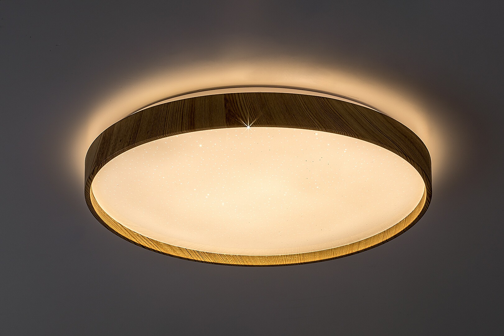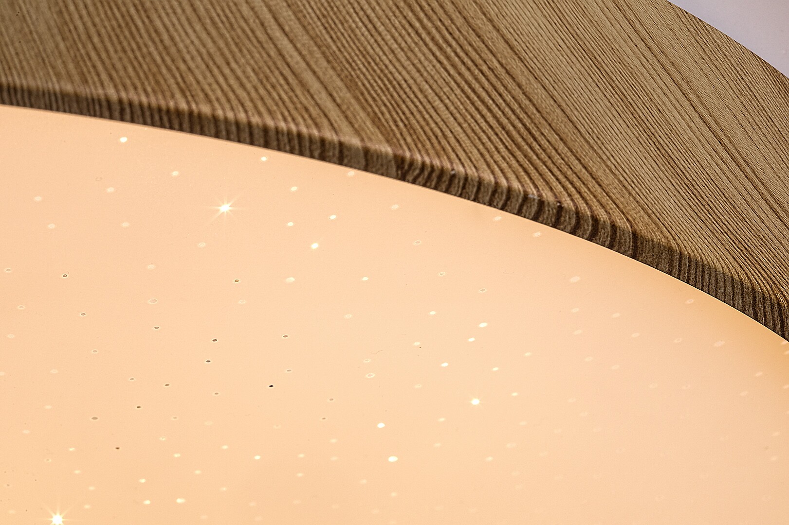 The nordic-style, large, round Leana 2 ceiling light can be a good choice into the living room, dining room or bedroom. Due to the wooden-effect elements this beech-coloured model characterized by a simple design creates a cosy, intimate atmosphere in the room, and this effect is strengthened by the lightsource emitting warm white light. The metal Leana 2 features a white plastic lampshade with a starry effect, and a built-in LED lightsource of the energy-class G is covered by the lampshade. It has a power of 24 W while the luminous flux of the lamp is 1,440 lumens with shade and 2,400 lumens without shade. Colour temperature of the lightsource is 3,000 K and it has an amazing life-span of 50,000 hours! The Leana 2 is kindly recommended to those who would be happy not having to replace the lamp for several years. The diameter of this ceiling light is 385 mm, distance from the ceiling is 60 mm.