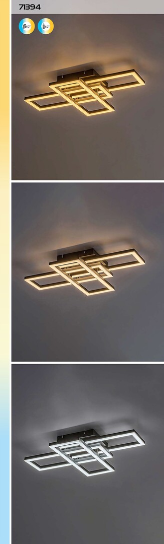 Rabalux Mereni ceiling light is the perfect choice for those who like LED lights with a truly modern, creative design. This eye-catching smart model is made of metal in black with a white plastic lampshade. The fixture is made up of three intersecting rectangular elements and the lamp can be fixed to the ceiling by means of a square decorative base. It has a built-in LED light source, the colour temperature of which can be adjusted by a wall switch or remote control. In addition, you can enjoy the benefits of adjustable brightness as well as memory, timer and nightlight functions, all of which can be operated by remote control. This versatile model is primarily recommended for modern living rooms, dining rooms and bedrooms. Due to the integrated LED technology, the lamp is characterised by energy-efficient operation and a long life-span.