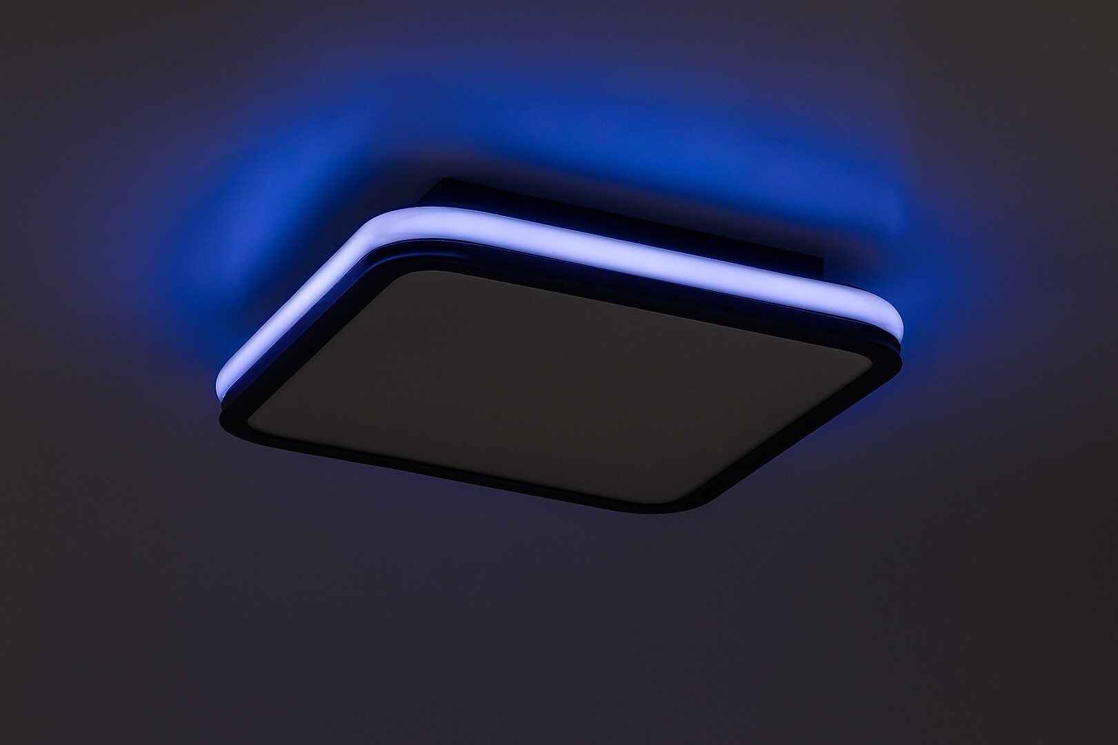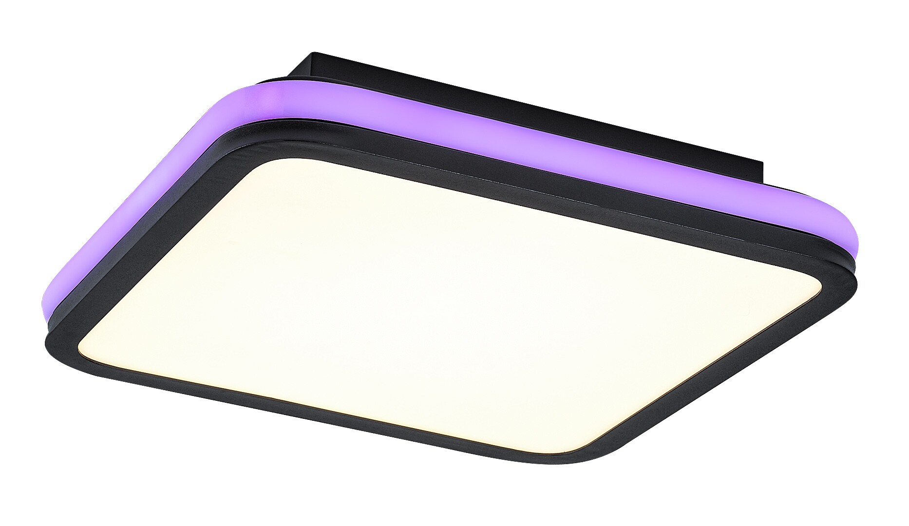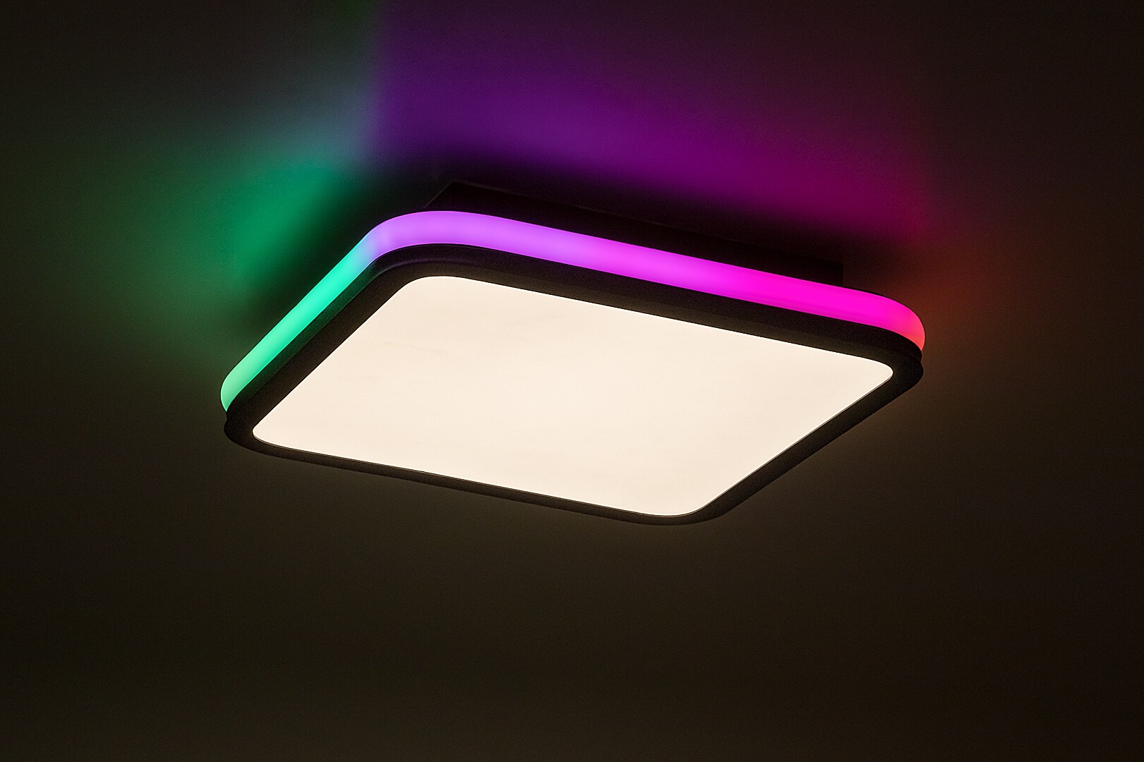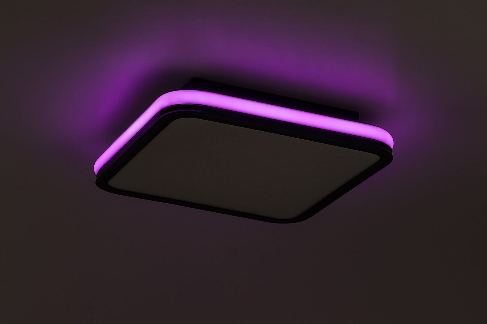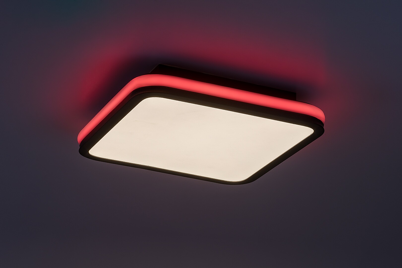 Rabalux Serkan smart ceiling light is the ideal choice for those who are looking for a model that combines extensive functionality with a clean look. The LED light is made of metal in black with a white plastic lampshade. The square shape of the lamp is softened by rounded corners. It has a built-in LED light source, the colour temperature of which can be adjusted by remote control or a wall switch. The lamp is capable of RGB lighting, which is highlighted by a band running around the side of the fixture. This external part can be switched separately. With the remote control supplied with the lamp, you can also adjust the brightness and take advantage of the memory function. Due to the LED technology, the ceiling light is characterised by energy-efficient operation and a long life-span. This versatile model is recommended for the living room, dining room or bedroom.