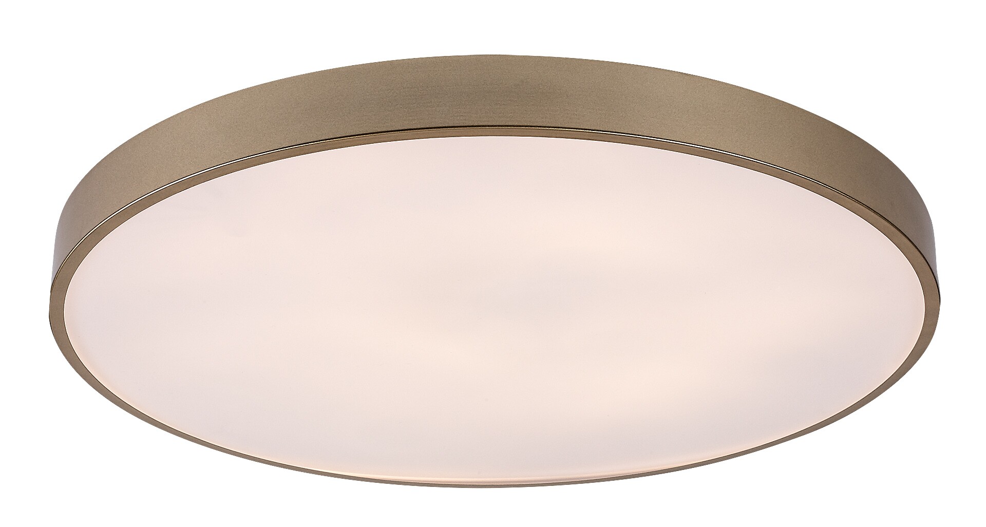 We recommend the large, round Tesia ceiling light to those who are looking for a simple yet elegant and versatile model into their modern living room or bedroom. This thin lamp is both practical and space-saving, at the same time it reliably provides the room’s illumination for several years. This golden coloured metal light is complemented by a white plastic lampshade. The Tesia has a built-in LED lightsource with a power of 60 W, a luminous flux of 3,760 lumens with shade and 4,800 lumens without shade, and an extraordinary life-span of 50,000 hours! Colour temperature of the flicker free lightsource can be adjusted between 3,000-6,000 K, i.e. it can radiate warm, natural or cold white light. In addition, the lamp is dimmable, i.e. its brightness can be adjusted, too, and it also has a memory and a nightlight function. The Tesia’s CRI (Colour Rendering Index) is above 80% which is considered excellent. This ceiling light has a diameter of 600 mm, distance from the ceiling is only 50 mm.
