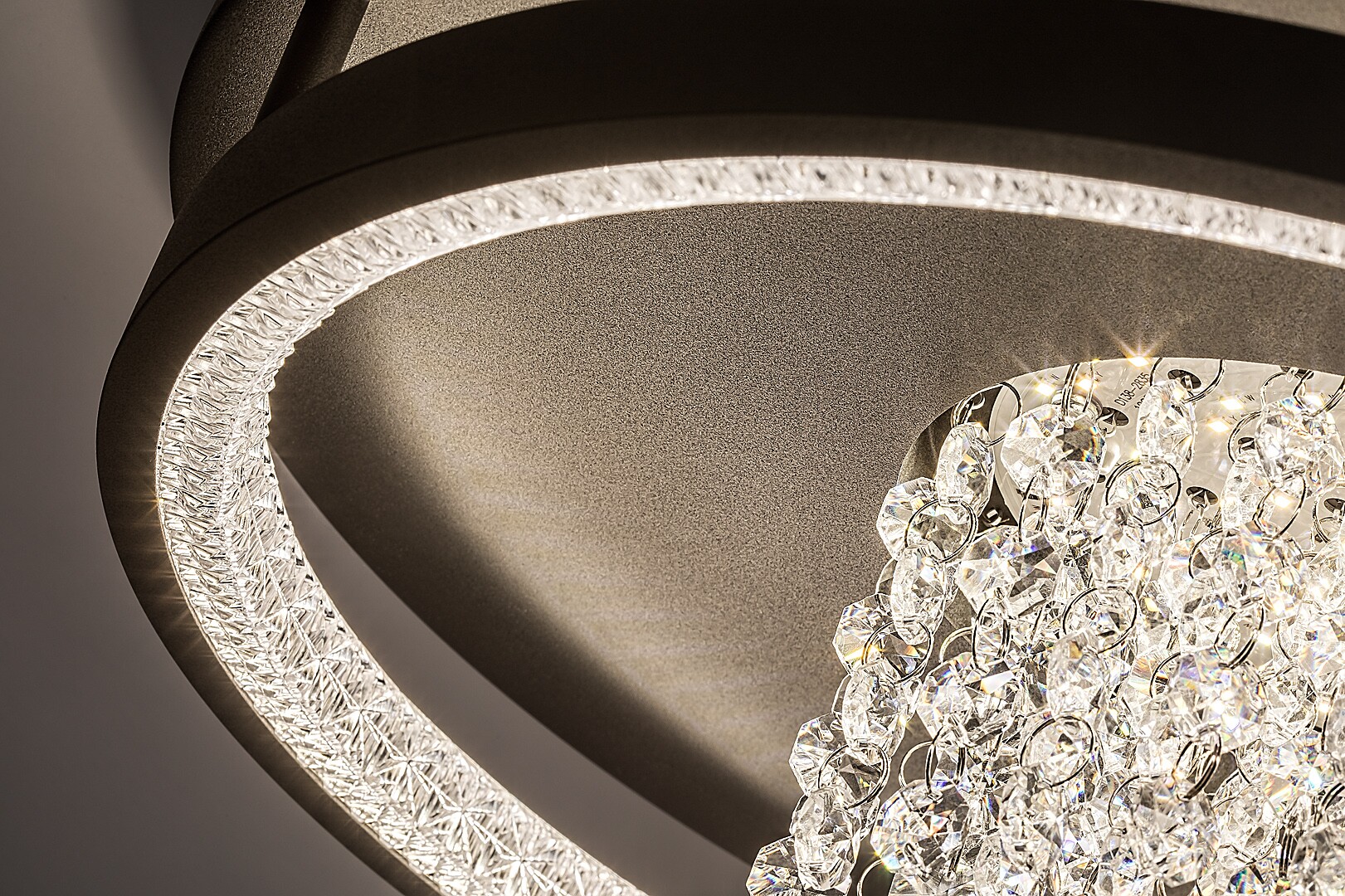 The Rabalux Maribell ceiling lamp is recommended for those who are looking for a chandelier effect LED lamp with a modern look for a more spacious room in their home. This elegant, shimmering model is perfect for the living room, dining room or bedroom. The large fixture is round, made of metal in black and is complemented by a transparent glass crystal shade. The lampshade runs around the inner rim of the lamp, and it is complemented by a cluster of crystal strands hanging down from the centre of the lamp. This beautiful chandelier features a built-in LED lightsource with DIP switch to adjust colour temperature in three variants: you can choose warm or natural white light. Due to the LED technology, the lamp is characterised by energy-efficient operation and a long life-span.