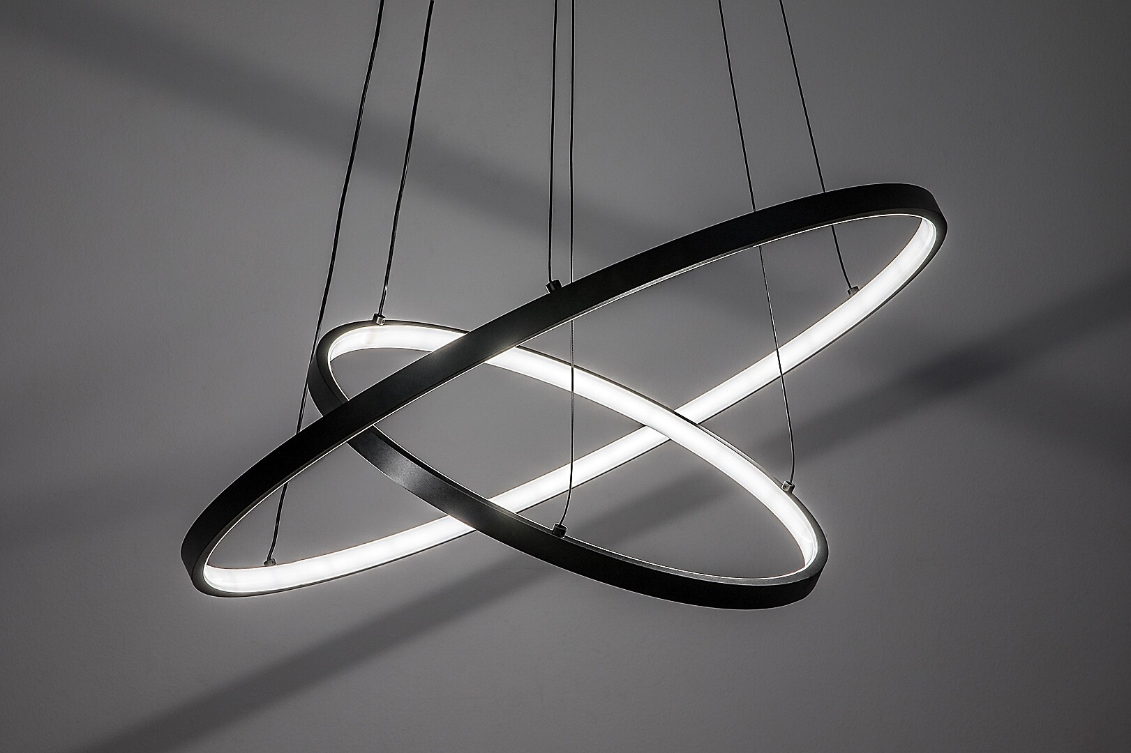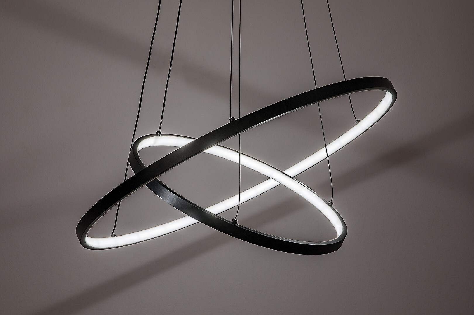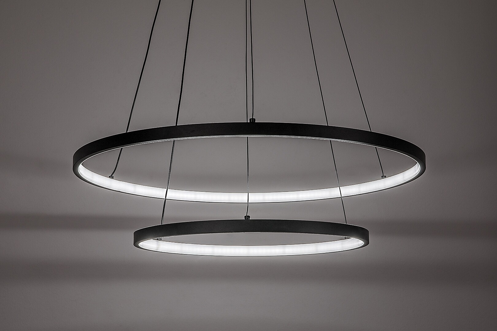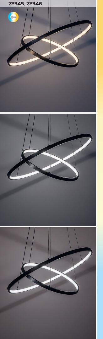 The Rabalux Beliza 2-bulb hanging light is recommended for those who value functionality and creative design. The modern pendant consists of two ring-shaped elements and is made of metal in black. The two rings have different diameters and can be positioned as desired. The lamp emits light on the inside of the rings and the bulbs are made of white silicone. The pendant lamp is complemented by a round black decorative base and silver-coloured metal cables. It has a built-in LED lightsource that ensures energy-efficient operation and a long life-span. Brightness and colour temperature can be adjusted by remote control. The smart hanging lamp also has a nightlight function. It is ideal for the living room, dining room or bedroom.