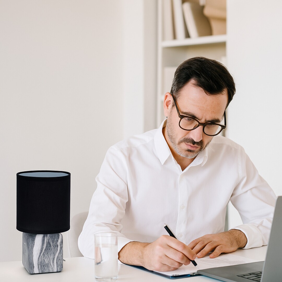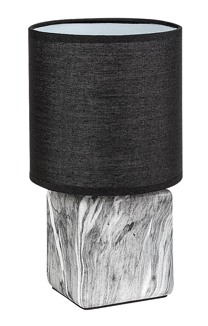 The Rabalux Nalisa table light is recommended for those who are looking for a modern, compact complementary lamp. This model combines round and angular shapes with natural-looking materials: it's made with a grey and white marble-effect ceramic block fixture and a black cylindrical textile shade that is open at the top and bottom. It is ideal for the bedroom or living room, placed on the nightstand or on a table. The dark-coloured lampshade allows for discreet lighting, so this table lamp is a good choice if you need to turn on the light during the night but don't want to disturb your partner. It can be operated with a single light bulb with a power of up to 40 W. Socket type is E14. The ceramic night-light comes with a black cable and a cable switch. It is supplied without a lightsource.
