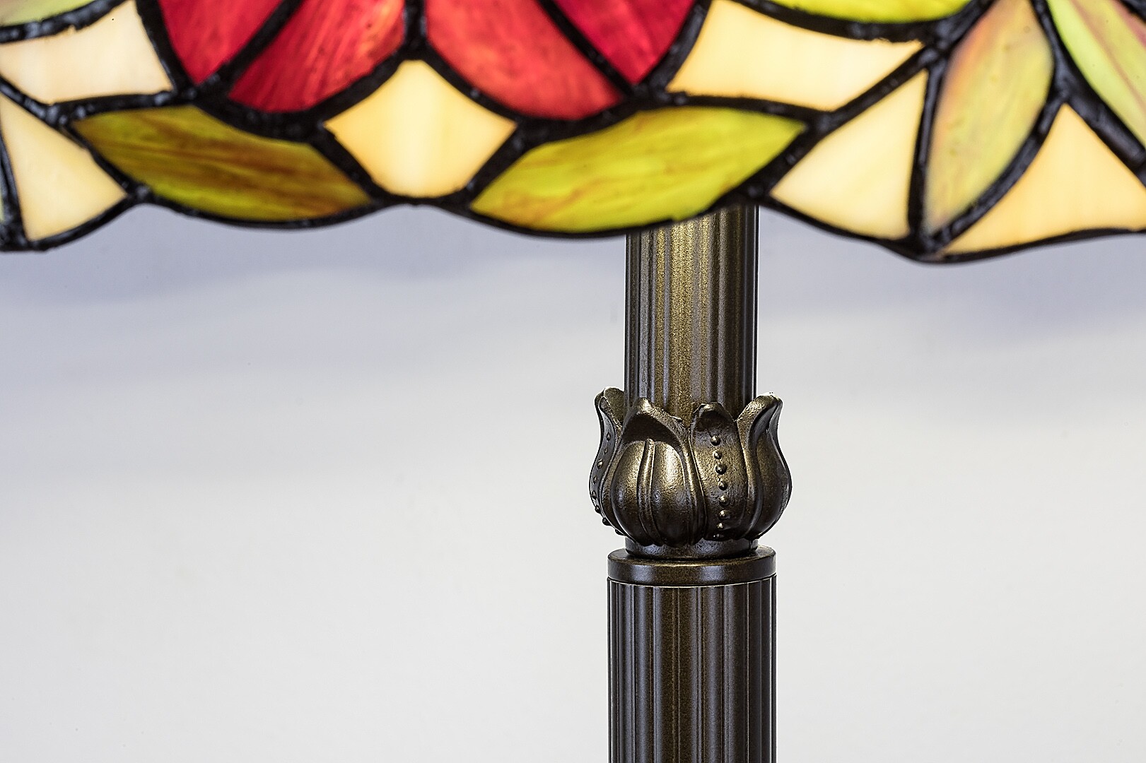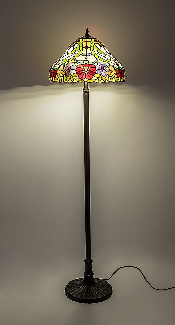 This unique, hand-made floor light with a Tiffany-style lampshade is a perfect choice if you are looking for classic elegant style and an incomparable and special piece. Technical specifications: a floor lamp with a Tiffany-style lampshade and 2 sockets. A 160 cm tall luminaire made of brass colored metal with a diameter of 46 cm, with a colorful, Tiffany-style glass lampshade, IP20 protection. The luminaire can also be used with 2 x power saving light sources up to 60W, with E-27 sockets.